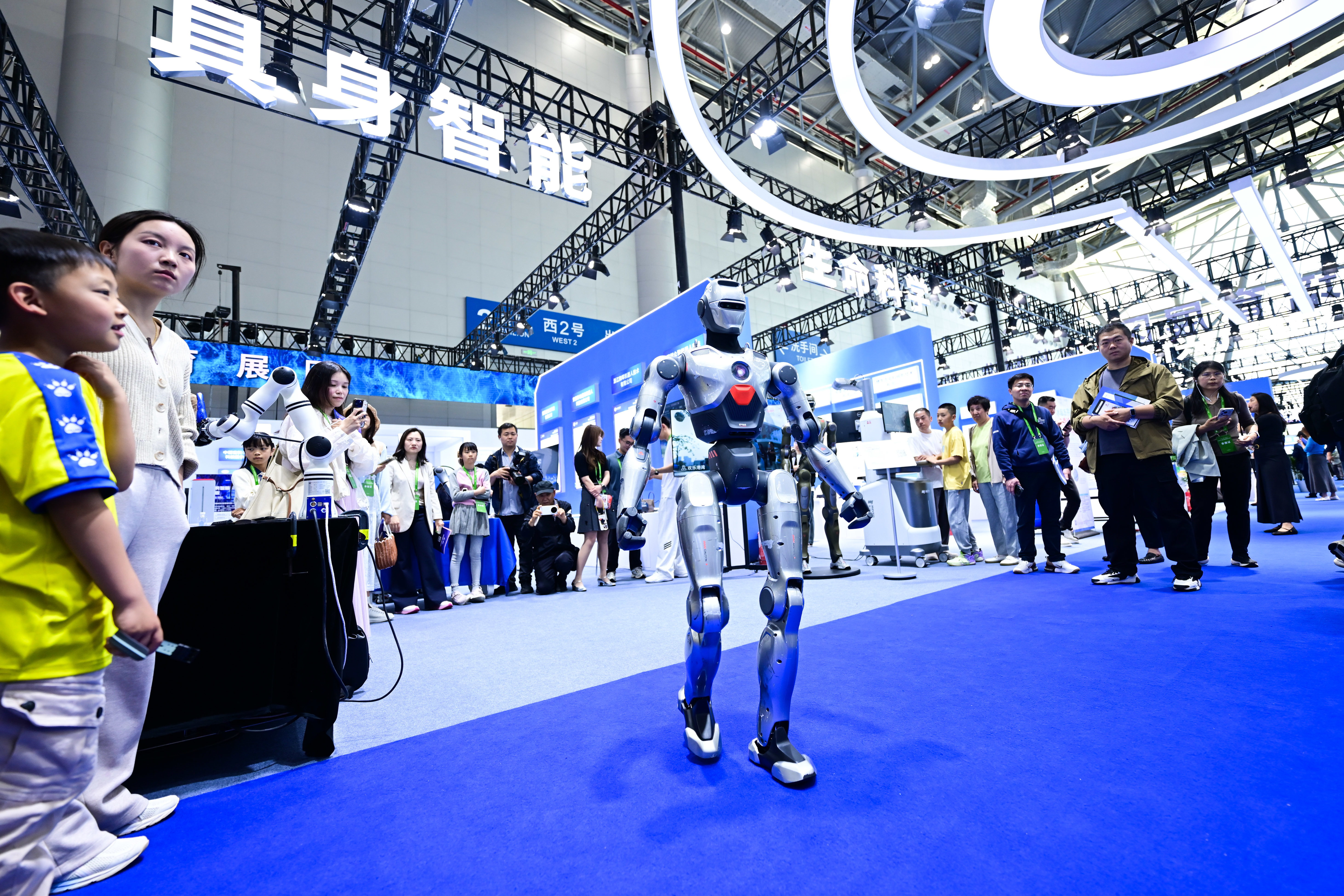 4月26日,观众在第四届中国(安徽)科技创新成果转化交易会上观看一款人形机器人。